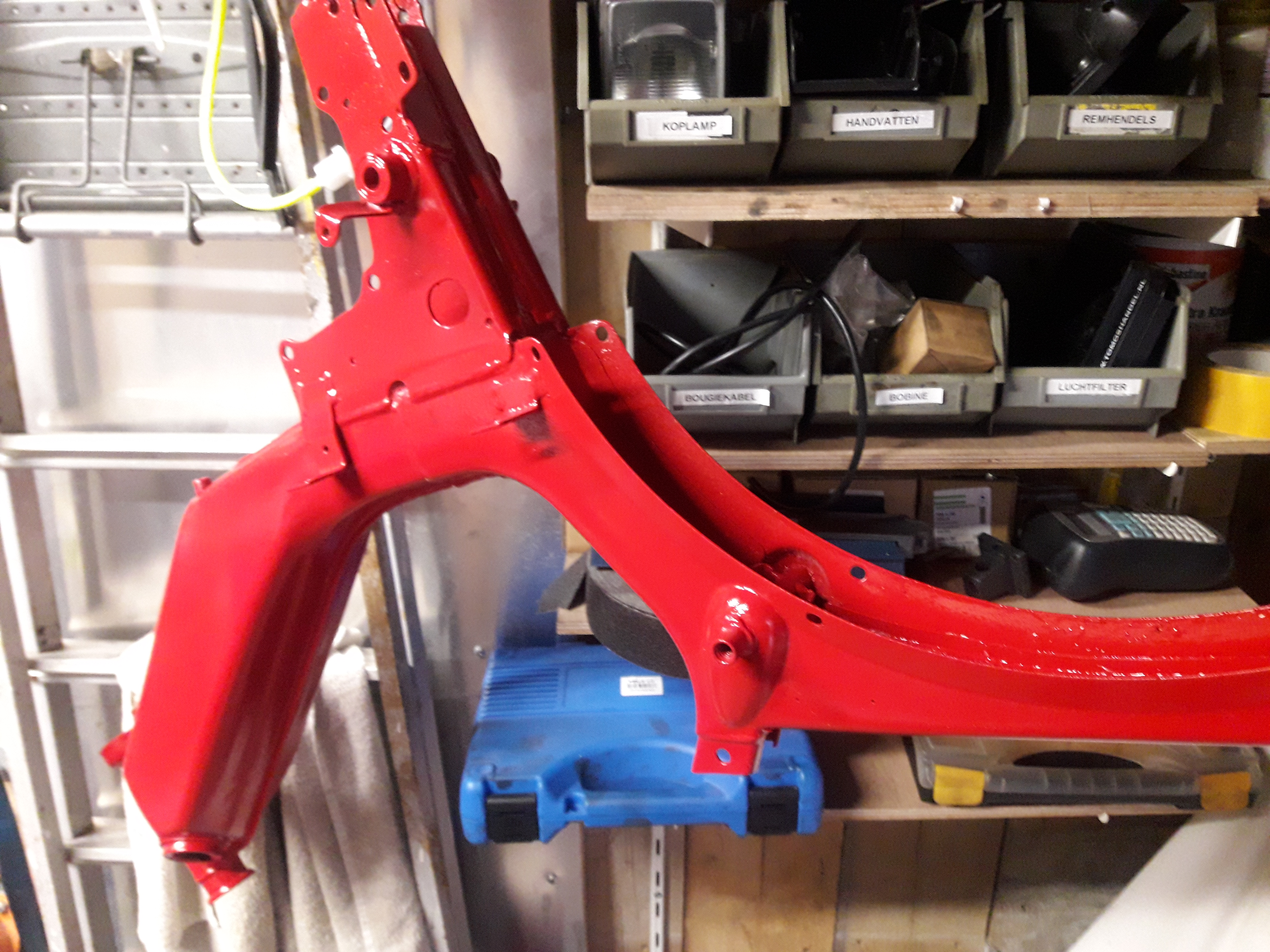 Het weer is weer wat beter aan het worden en andere zaken zijn opgelost, dan is het weer tijd om verder te gaan met de spuitwerkzaamheden voor het tomosje. Na alles te hebben behandeld met 2K grondverf is de 1K lak erop gekomen en deze is weer behandeld met 2K vernis. Dit om een mooie afwerking te verkrijgen en benzine bestendig te maken zodat de lak niet wordt afgebeten. Hierbij het resultaat tot nu toe.