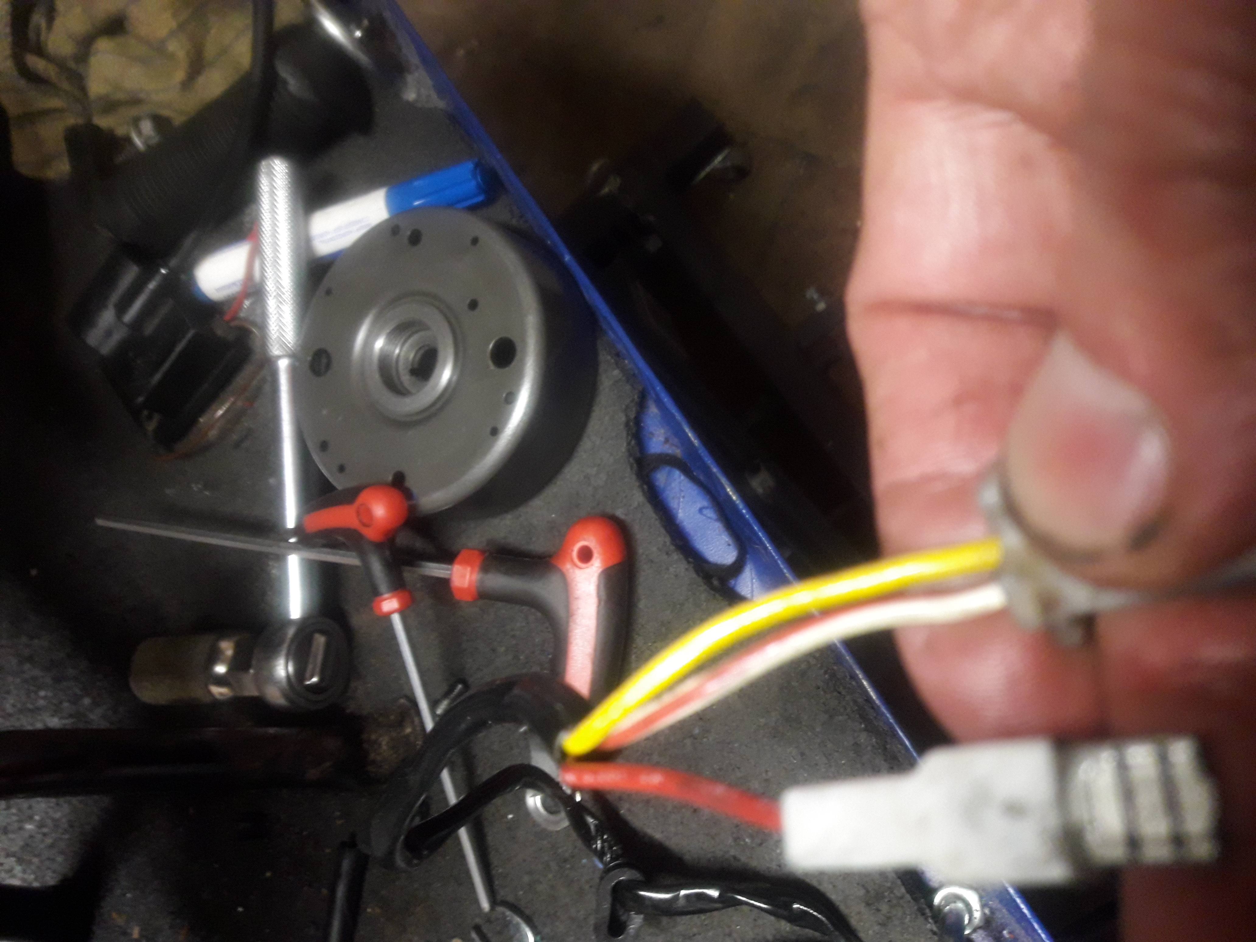Rood is ontsteking, geel is licht. Voor testen hoef je alleen de rode aan te sluiten. De rood/witte is gelijkspanning voor e-start. Die heb je niet persé nodig maar isoleer m wel even tegen ongewenst contact.