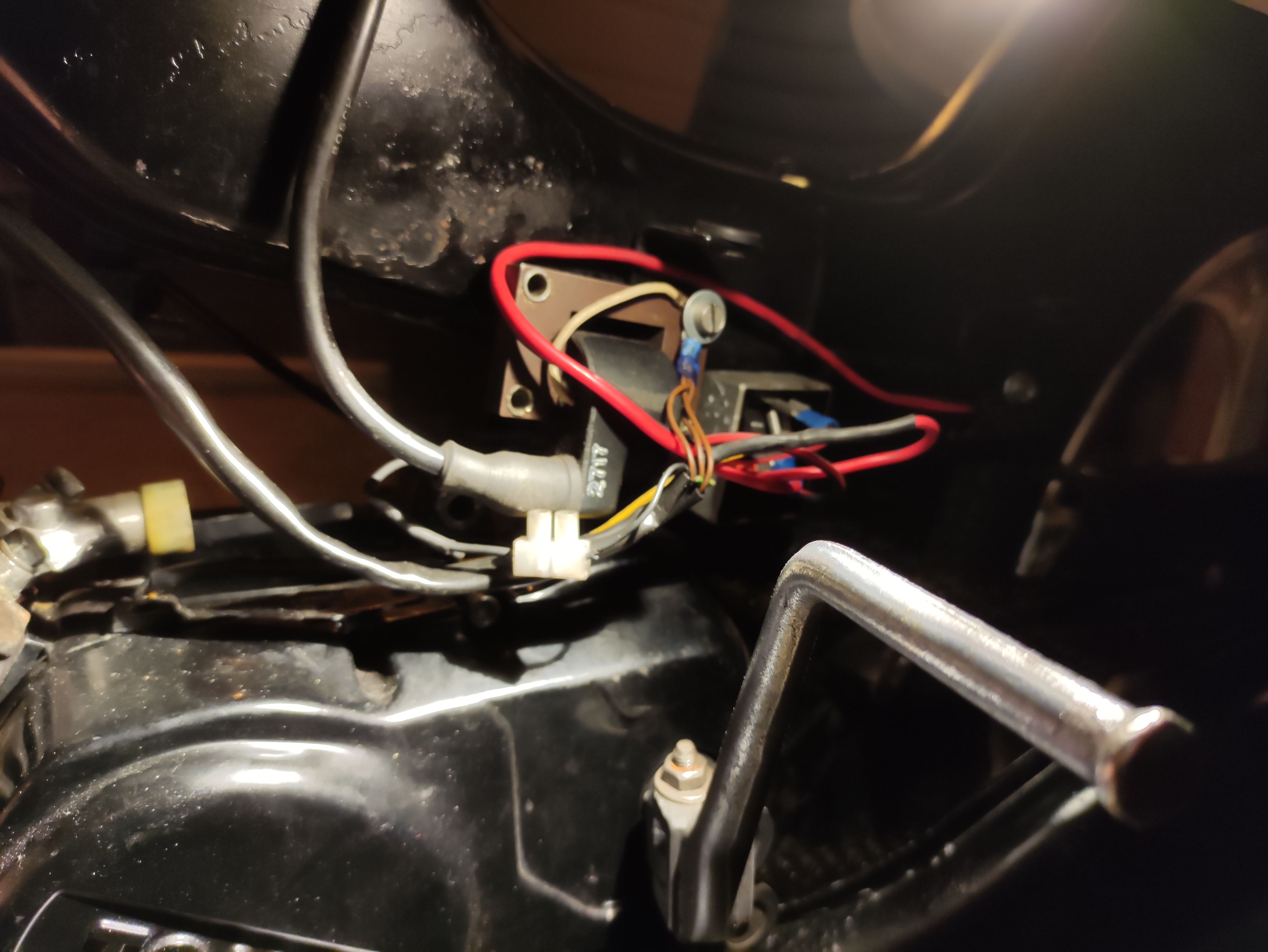 - Wat voor ontsteking zit erin? Dat kun je zien aan de bobine (onder de linker kap). Een plastic versie (heet CDI) is voor 4-spoels electronische ontsteking. Zit er nog een ijzeren kern bobine dan heb je punten.