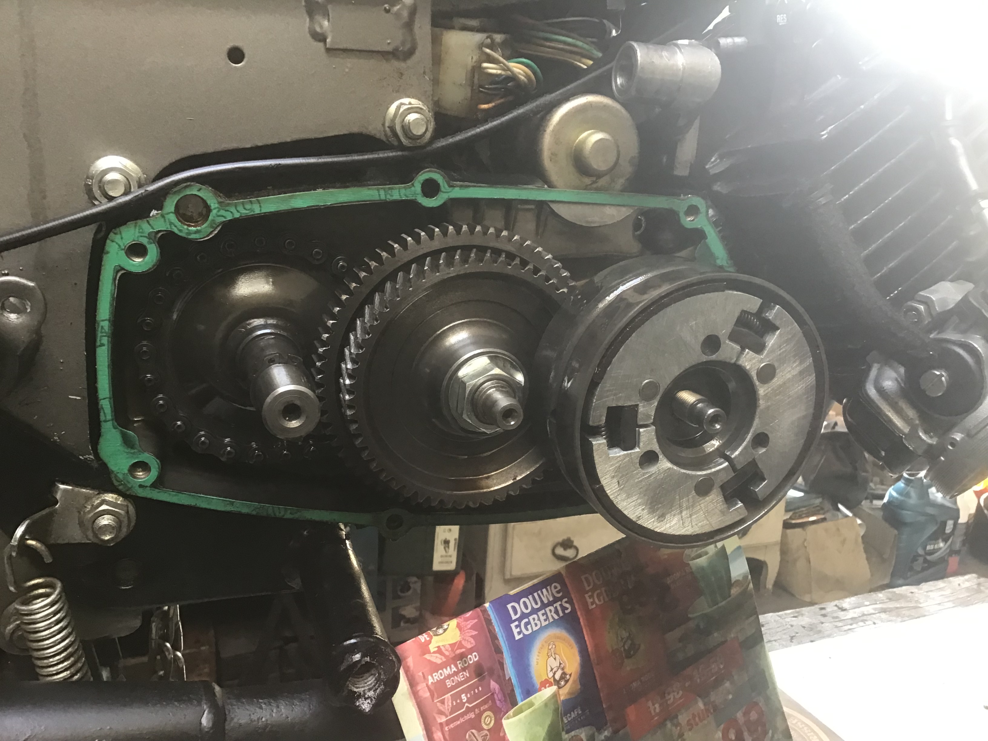 Ik heb nog verder onderzoek gedaan. De vraag is of het normaal is dat je een licht draaiend geluid hoort uit het rechter carter als je de brommer vooruit duwt. Ik heb het carter open gemaakt en het geluid komt van het voorste grote tandwiel van de tweede versnelling. Ook als je de koppeling er uit haalt, en deze dus niet meedraait, blijft het geluid hetzelfde. Dit tandwiel draait los mee als je in rijrichting aan het achterwiel draait. Het geluid komt van de vrijloop in dit tandwiel. Ik neem aan dat dit normaal is?