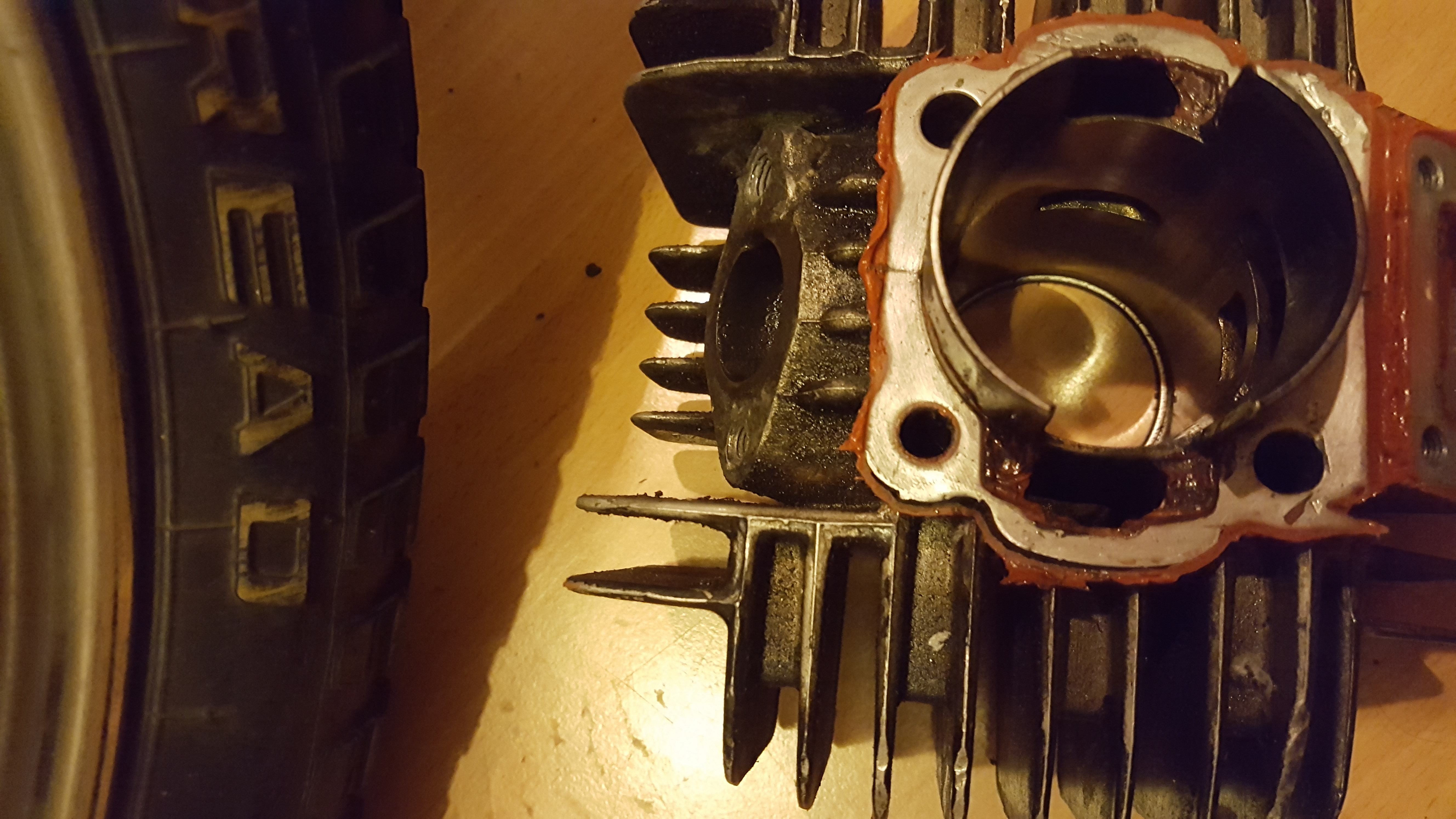Wat ik ook was vergeten te melden, ja hoe dan inderdaad, is dat mijn schoonpa aan de cylinder heeft moeten lassen om de schroefdraad voor uitlaat bevestiging te repareren. Een paar doorgesnoven gasten hebben zo hard tegen de uitlaat staan trappen dat de helicoil uit de uitlaat manifold is gekomen. Deze was niet meer te repareren. Mijn schoonpa heeft het daarom helemaal eraf moeten slijpen en metaal erop moeten punt lassen waar hij daarna schroefdraad in heeft getapt. Redelijk briljant dat hem dat is gelukt als je het mij vraagt.