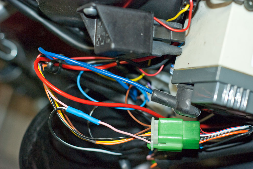 De roze draad waarvan de 12 Volt afgetapt wordt. Goede soldeertechniek en een stukje krimpkous bieden uitkomst.
