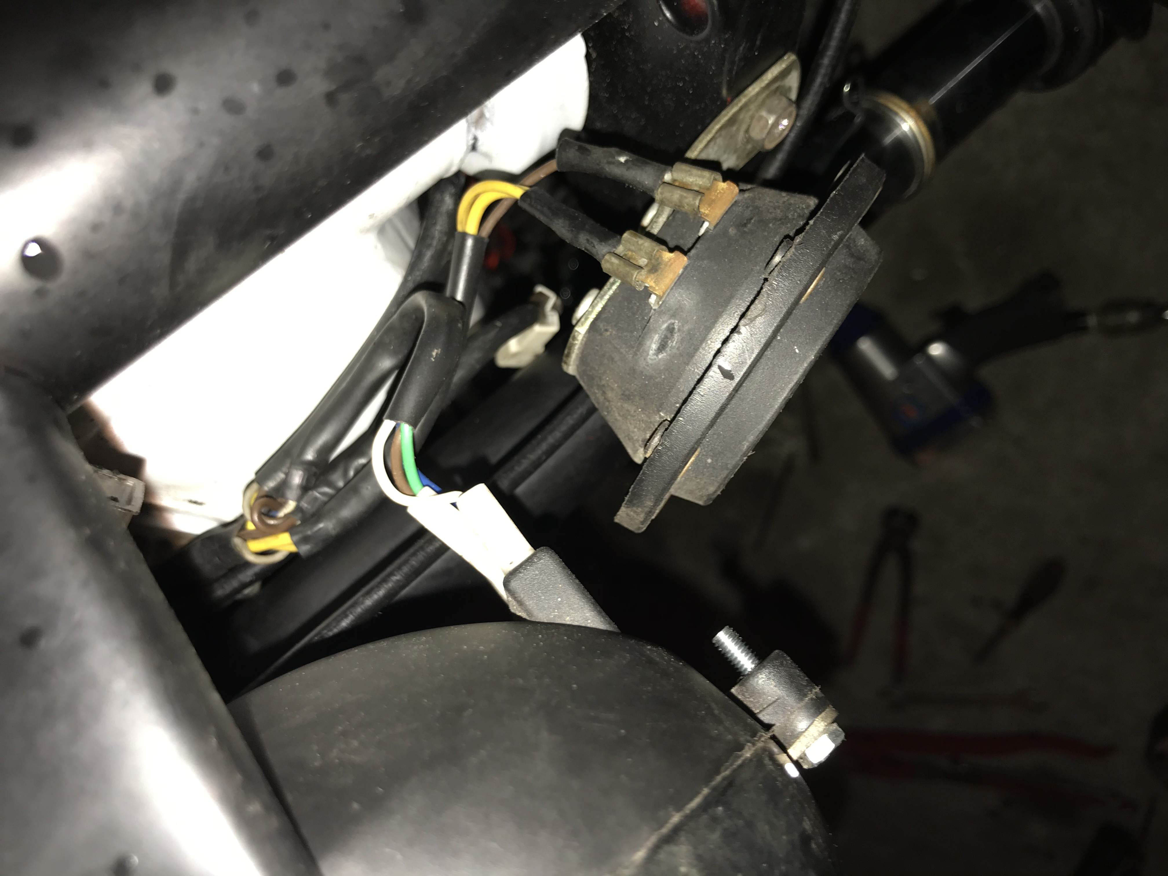 Ook weet ik niet hoe ik eigenlijk heel de kabelboom aan moet sluiten. Ik heb bij de voorkant 2 kabels naar de toeter en 3 draden naar de koplamp. De kabelboom loopt dan naar beneden en de gele heb ik nu op de spanningsregelaar zitten en op de ontsteking(gele draad uit de ontsteking) dan heb ik bruine op de massa zitten en de zwarte en grijze kabel loshangen. Voor het achterlicht heb ik hem contact laten maken en hang de andere nog los.