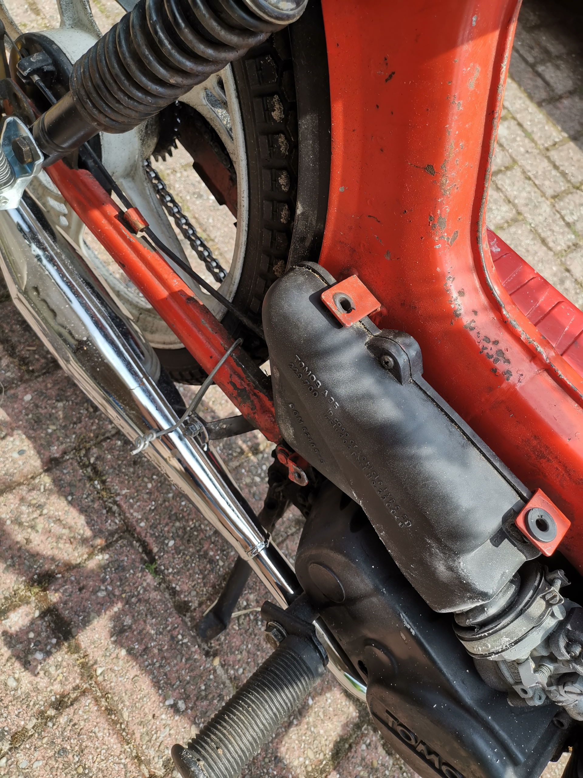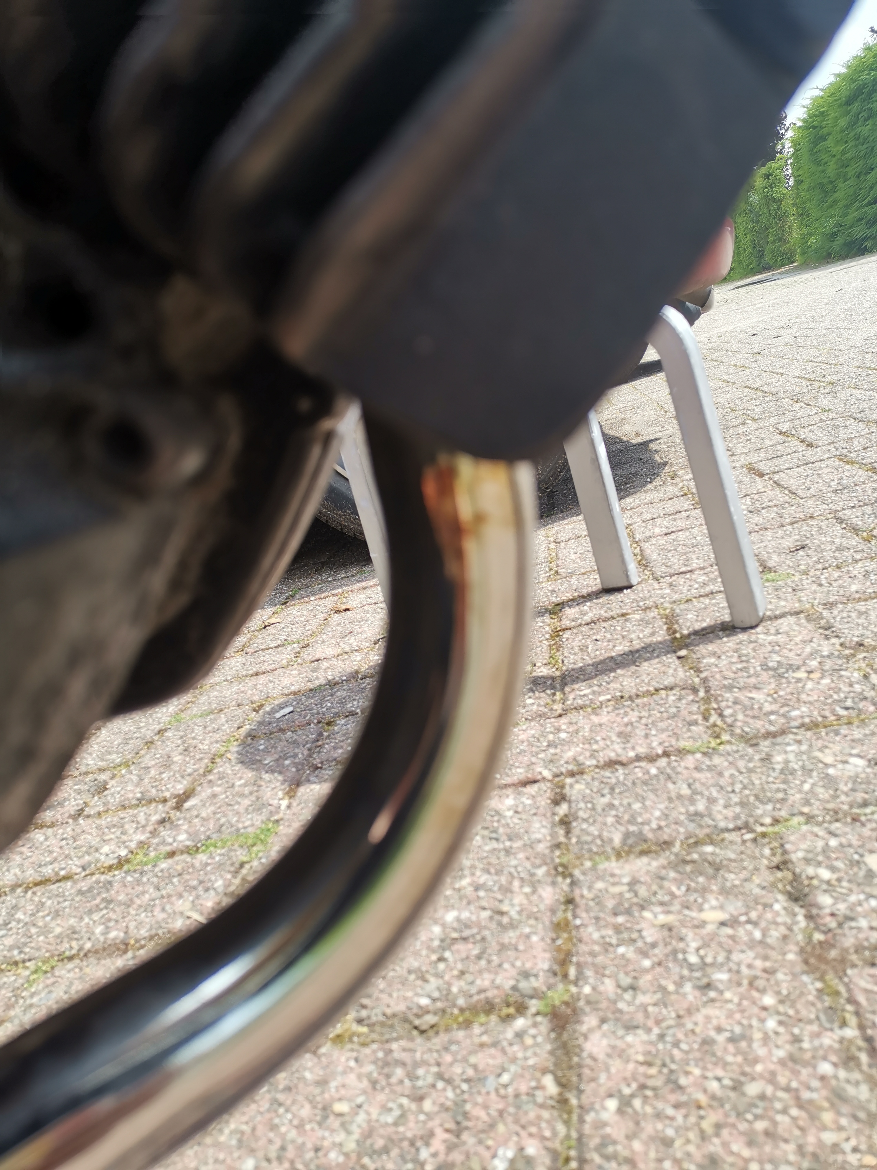 Ja klopt dit was tijdelijk anders hing die los en dat was nog slechter geweest maar de orginele beugel is nu gelast en hangt nu weer vast.Heb je de uitlaat aan de achterbrug vast gemaakt met ijzer draad (foto 11)