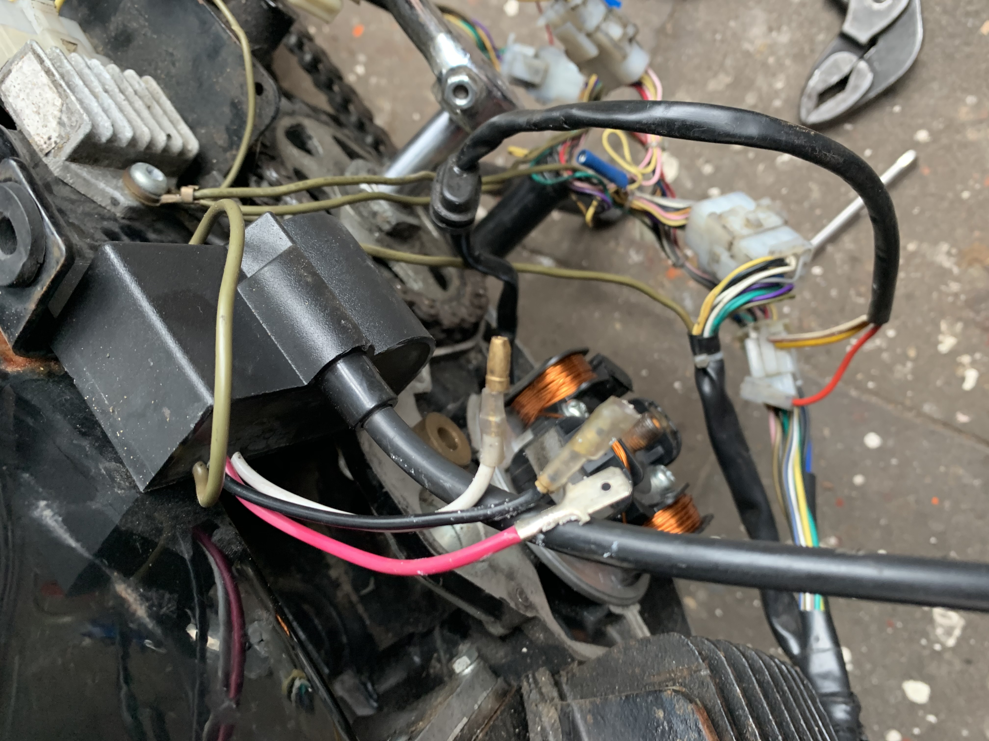 Jij hebt een rode met witte draad aan de ontsteking en die zit normaal op de spannings regelaar dc aansluiting...dat is voor modellen met accu....als je geen accu hebt kun je de draad afplakken.