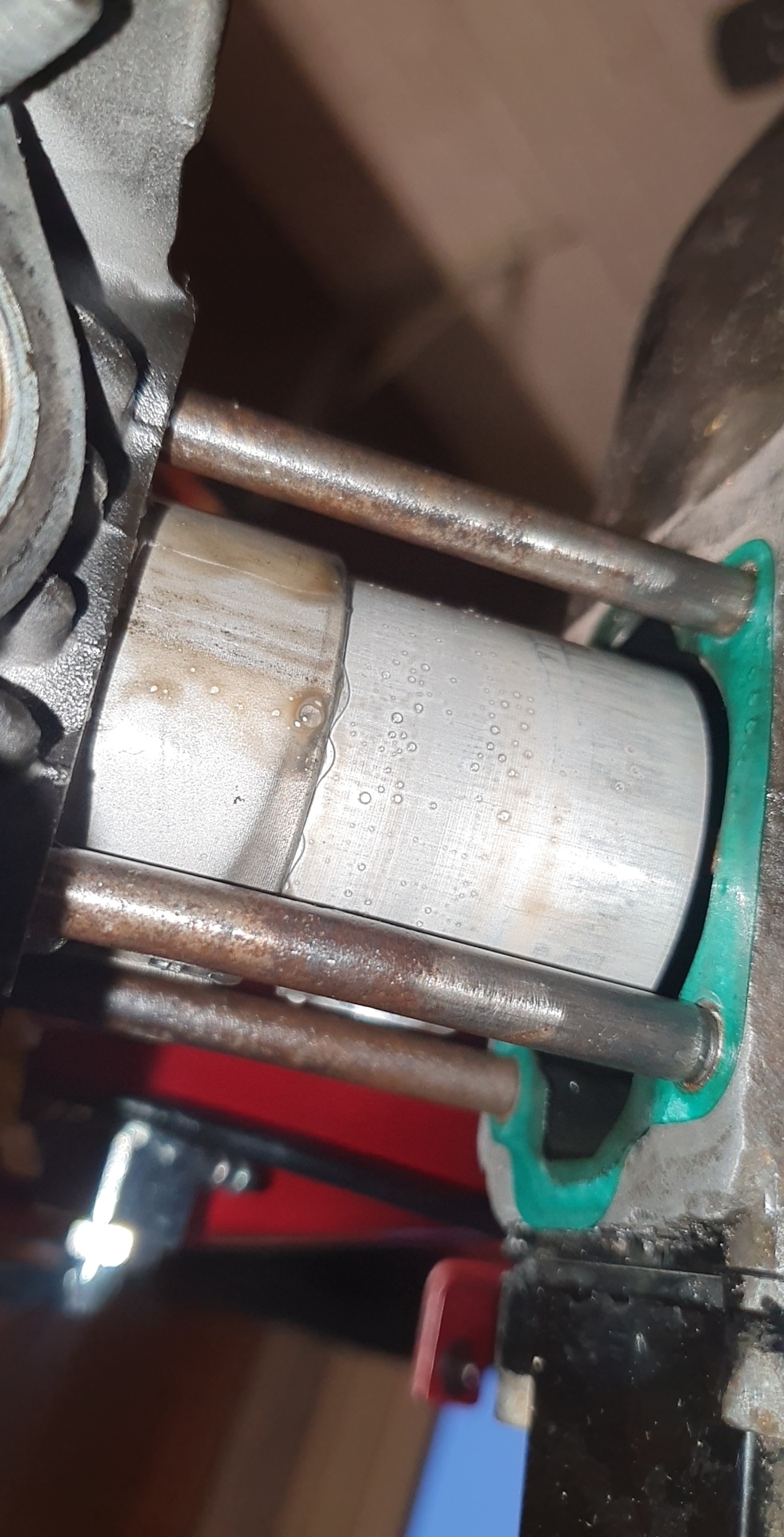 Verder lijkt het wel of er water ipv mengsmering op de zuiger zit....heeft hij in de regen gestaan??